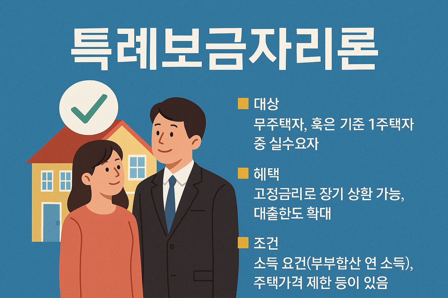 특례보금자리론은 무주택자 또는 1주택자 중 일정 조건을 충족하는 사람을 대상으로 제공되는 장기 고정금리 상품입니다.